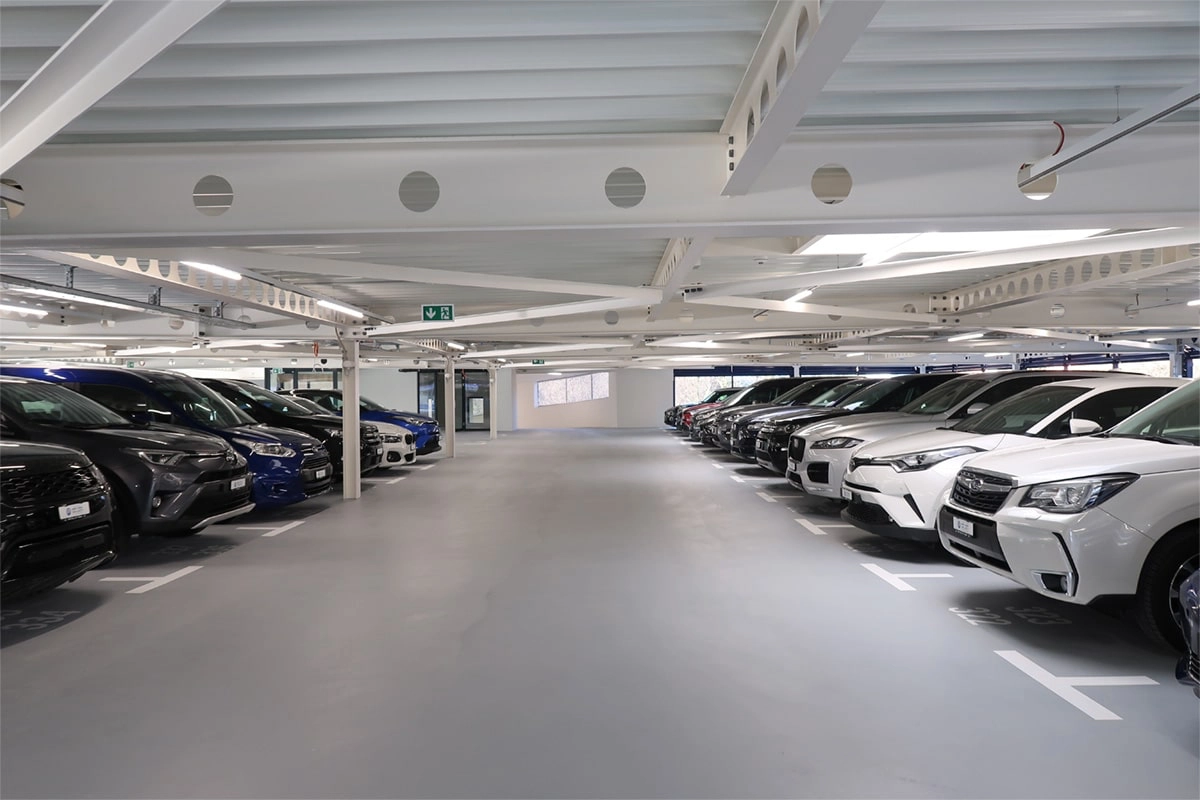 Parking de 2 étages, réalisation en activité par étages, marquage des places de parc.