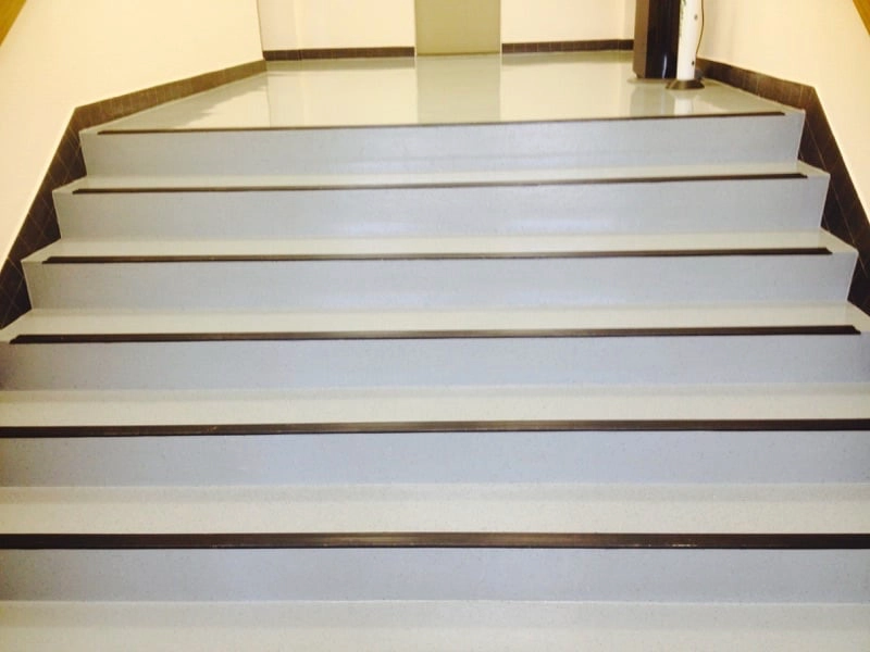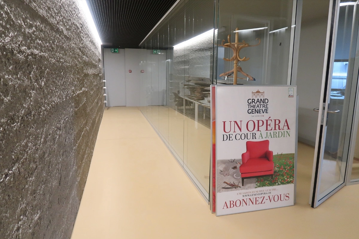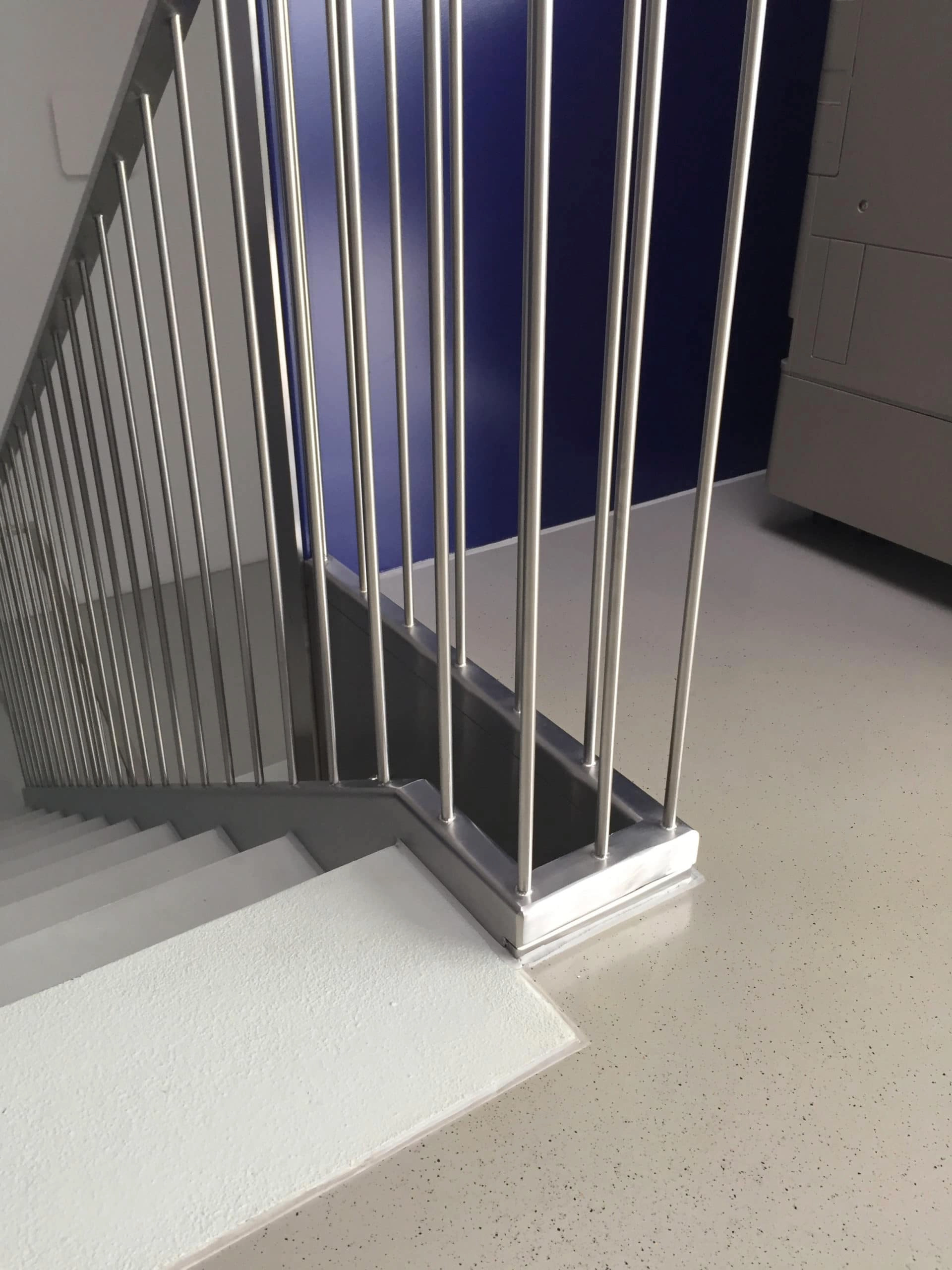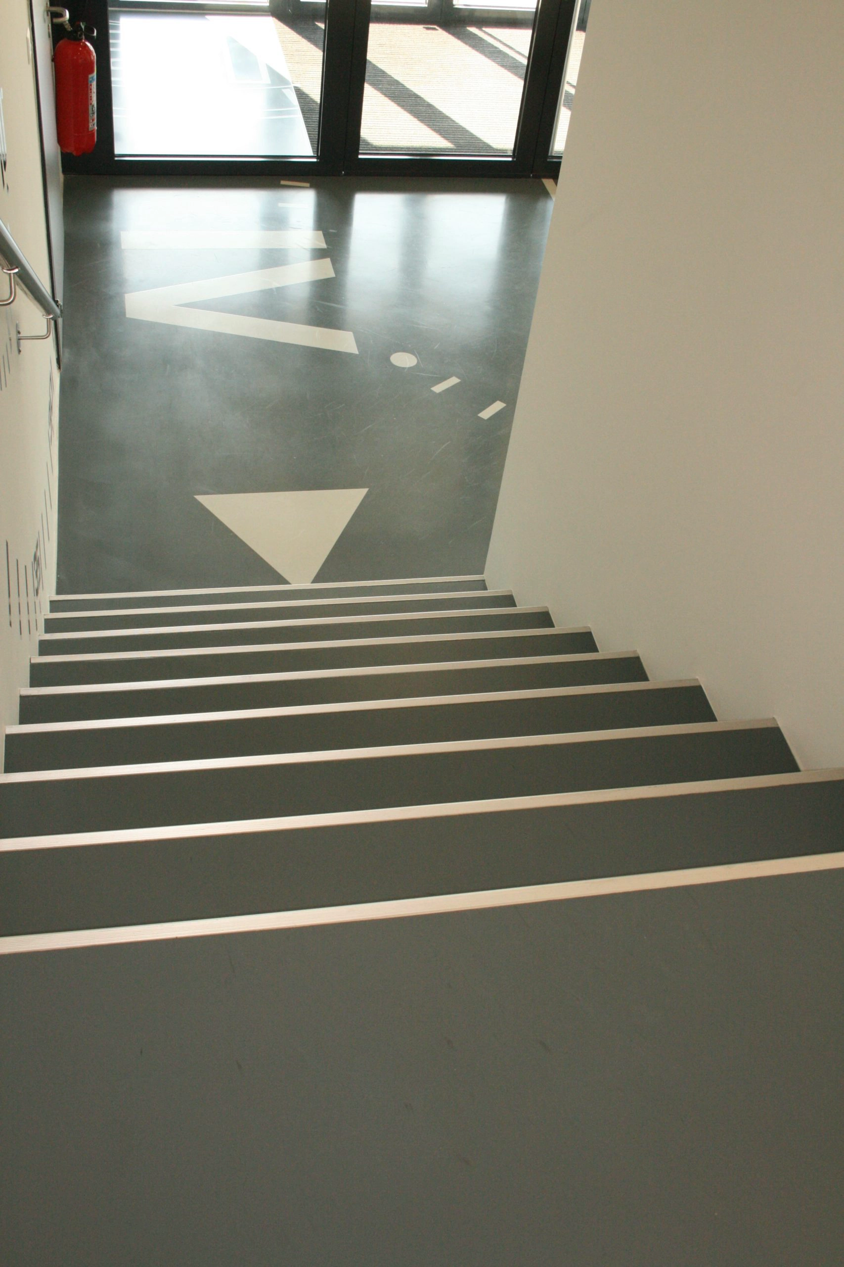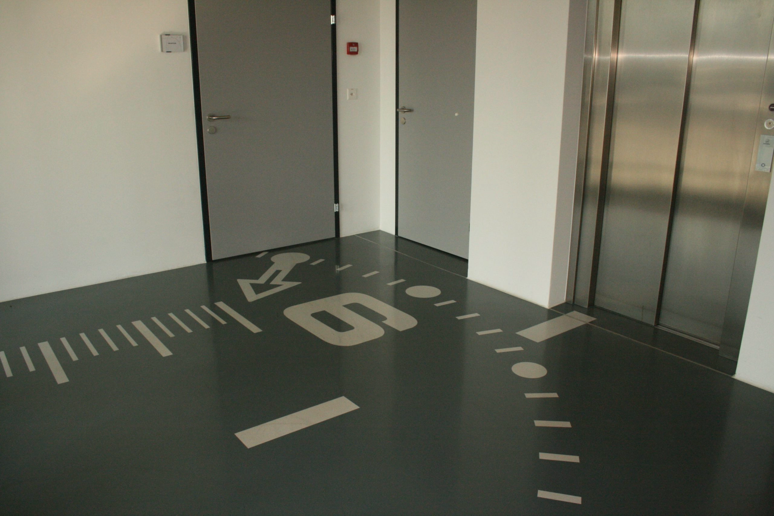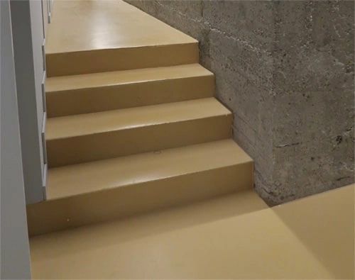 Revêtement PU-SI déco (lazuré) dans entrée, locaux administratifs, cafétéria et escaliers.