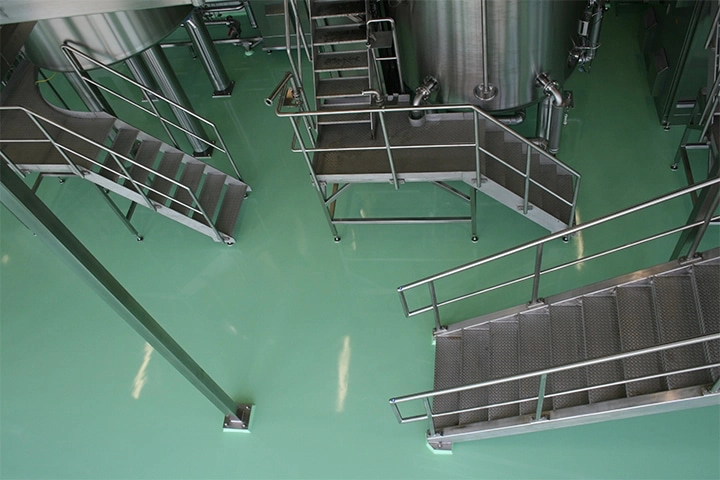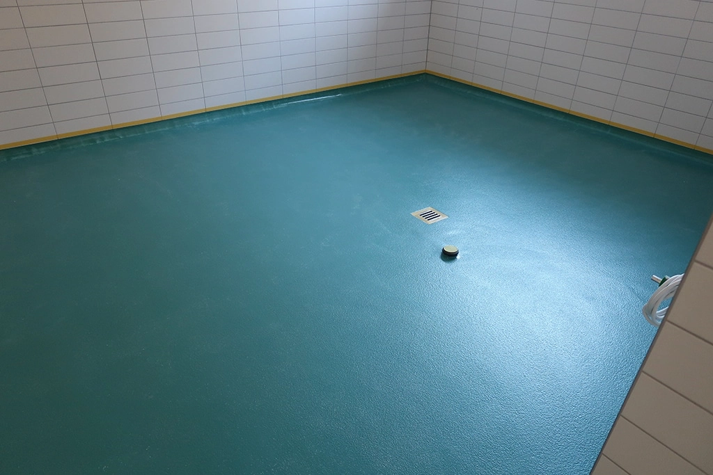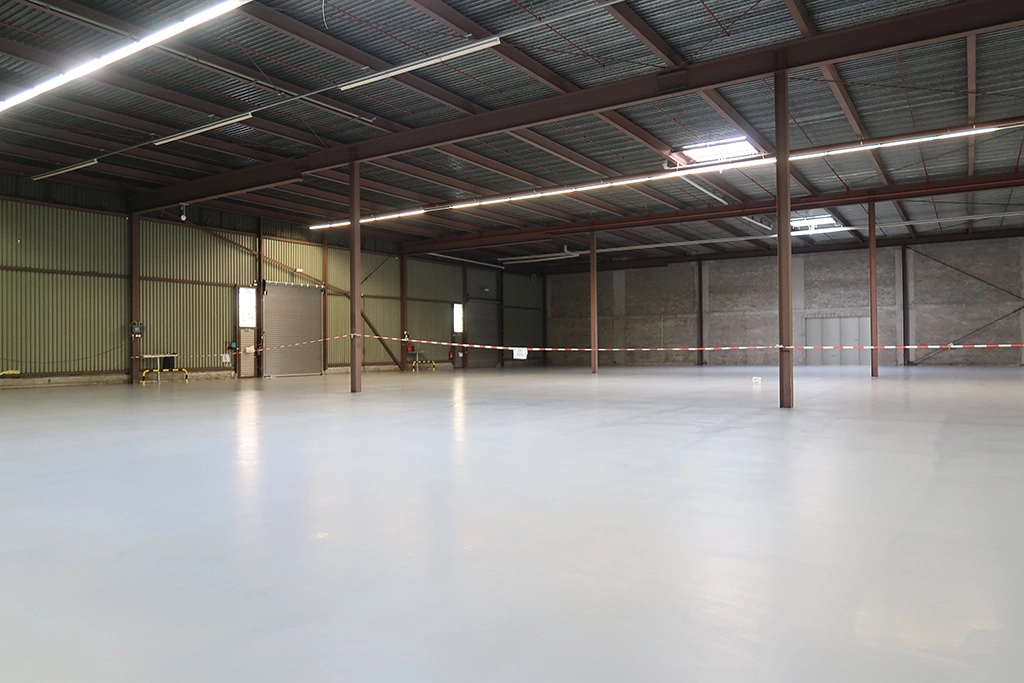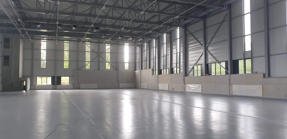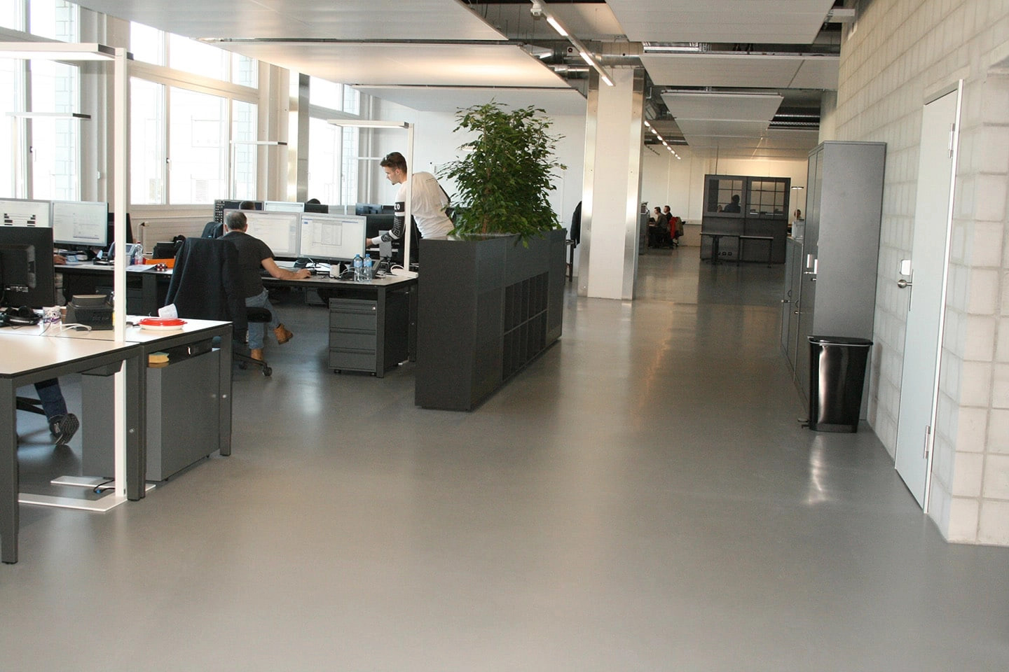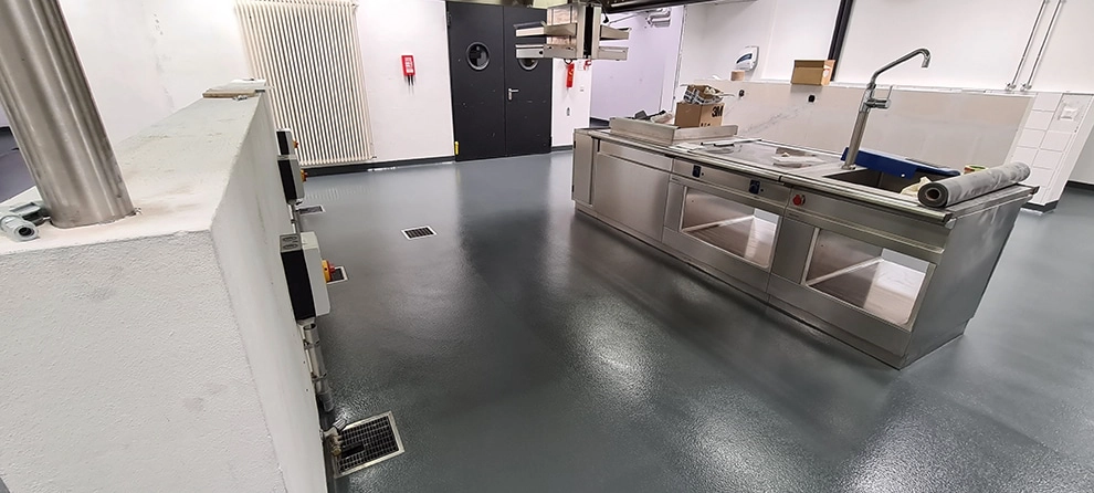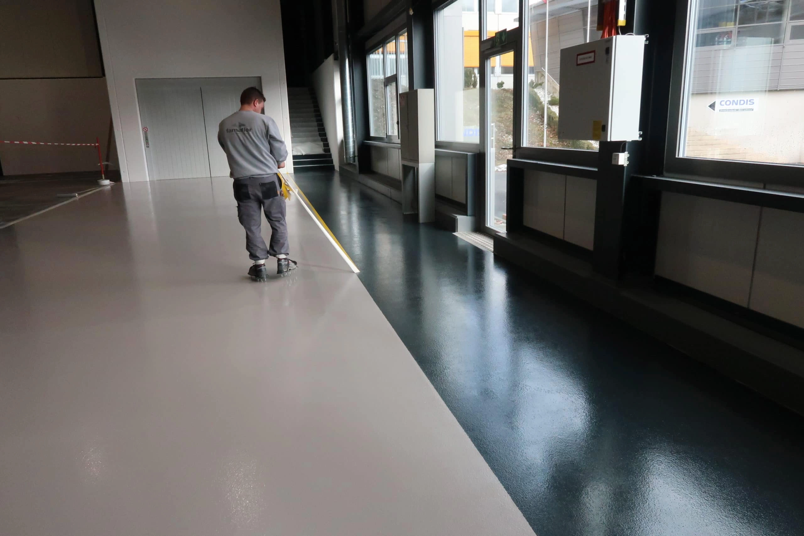 Atelier en revêtement époxy structuré. Bureaux, vestiaires et couloirs en revêtement époxy lisse.