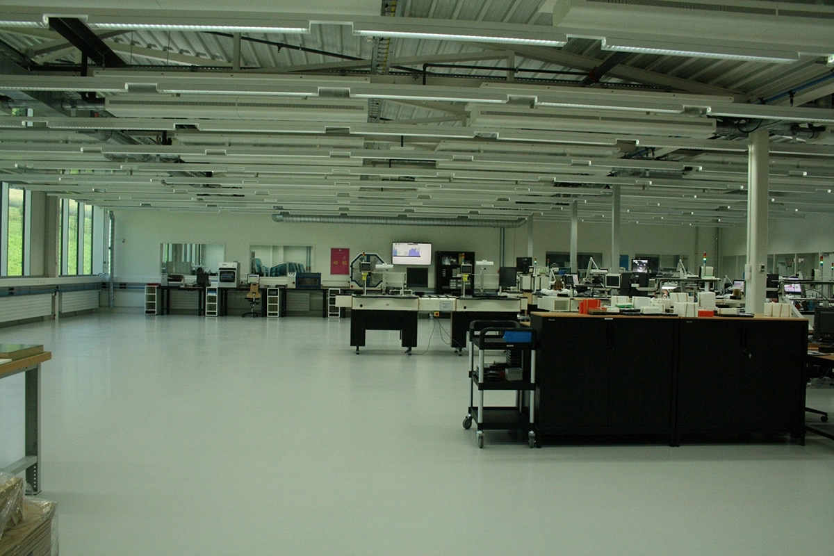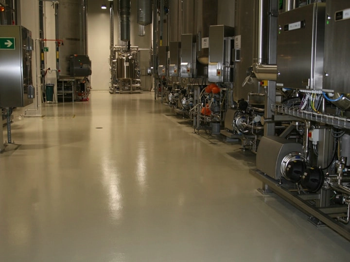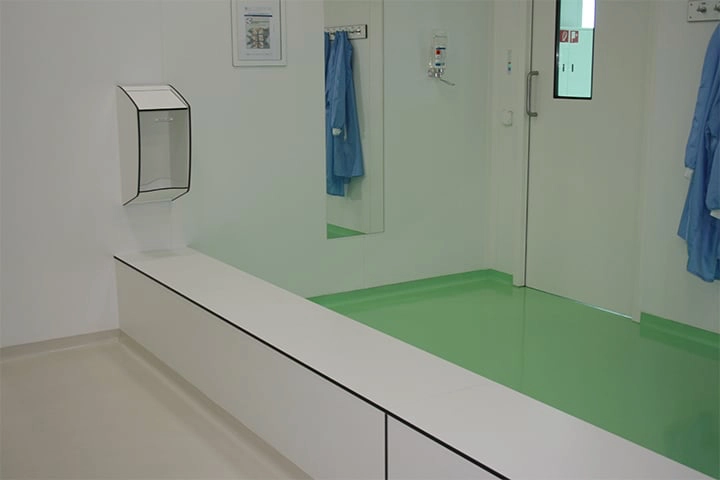 Complexe de recherche et production pharma : Revêtement correspondant aux exigences de résistances chimiques, mécaniques et hygiéniques très élevées. Locaux : production, laboratoires, salles blanches,….