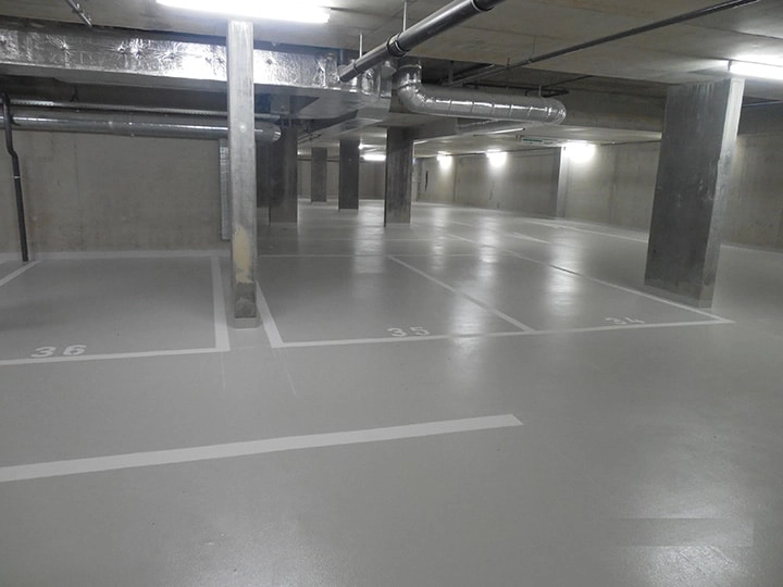 Traitement du parking en polyuréthane pour favoriser le pontage des éventuelles fissures