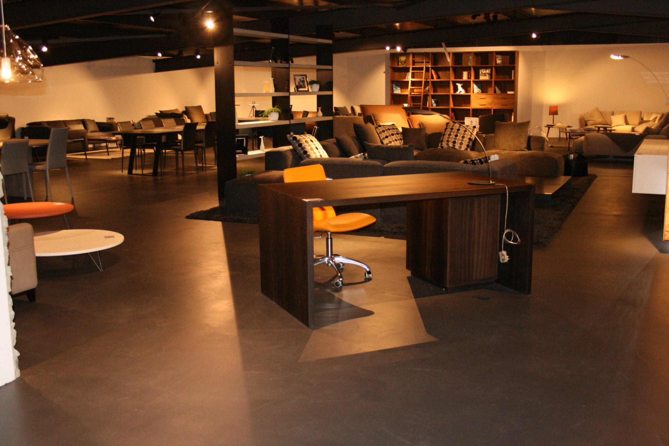 Sur 2 étages, expo de meubles haut de gamme mis en valeur sur ce revêtement déco noir.
