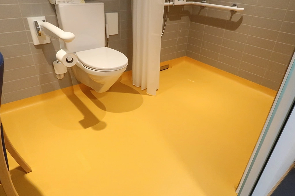 Transformation et agrandissement de l’EMS de Jeuss en fonction pendant les travaux « Principalement les salles d’eau à l’Italienne » Revêtement semi-souple et antidérapant à…